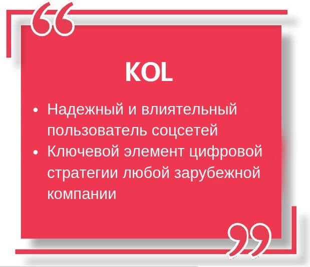 Авторитетный лидер мнений (KOL) – влиятельные личности в соцсетях и различных сферах, таких как кино, музыка, мода и так далее. В большинстве случаев, KOL – это блогеры, которые имеют сотни тысяч (а иногда и миллионы) подписчиков.