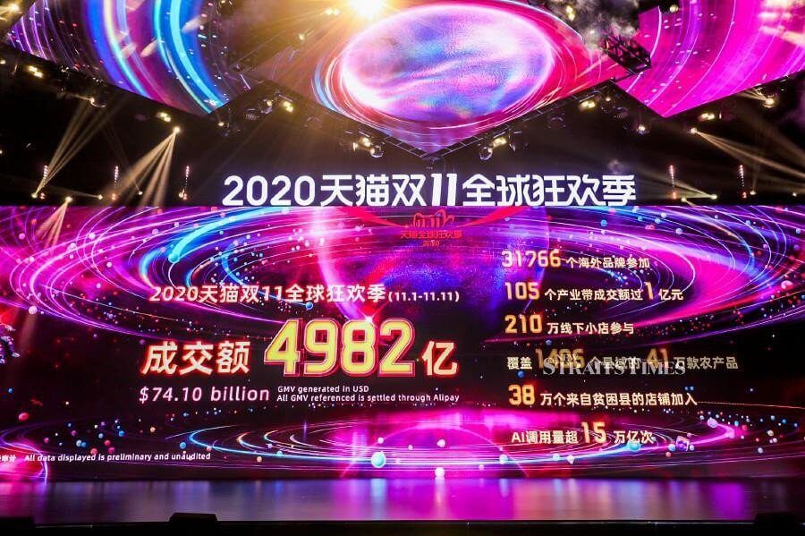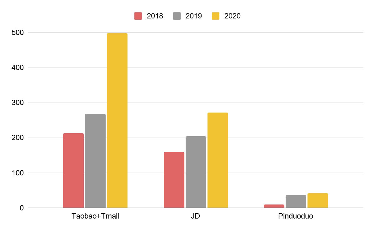 Объем продаж китайских e-commerce площадок во время 11/11 за 2018-2020 (млрд юаней)