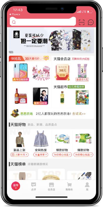 Даже главная страница Tmall выглядит на класс выше, с меньшим количеством текста, беспорядка и ежедневными предложениями, что поддерживает репутацию Tmall как премиального приложения для покупок в Китае.