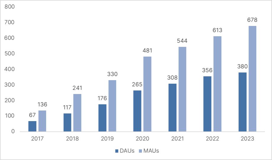 Динамика активных пользователей (DAU, MAU) Kuaishou в 2017-2023 гг., млн чел. Источник: Kuaishou Annual Report 2023.