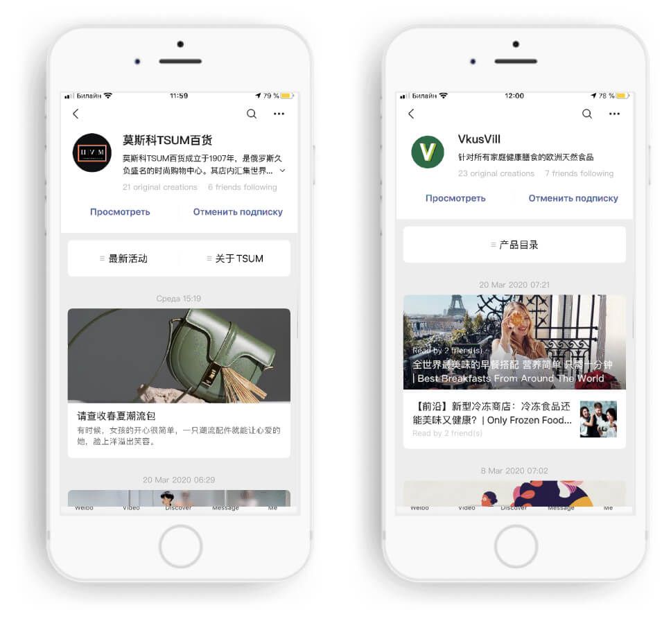 В приложении пользователи могут подписываться на другие аккаунты (по аналогии с каналами на Telegram или бизнес-страницей на Facebook, чтобы получать необходимую информацию. Такие аккаунты называются “подписные” и “сервисные”. Подписные аккаунты WeChat пользуются популярностью у лидеров мнений, а сервисные аккаунты отлично подходят бизнесу для трансляции подписчикам любых инфоповодов или обработки входящих запросов от китайских пользователей.