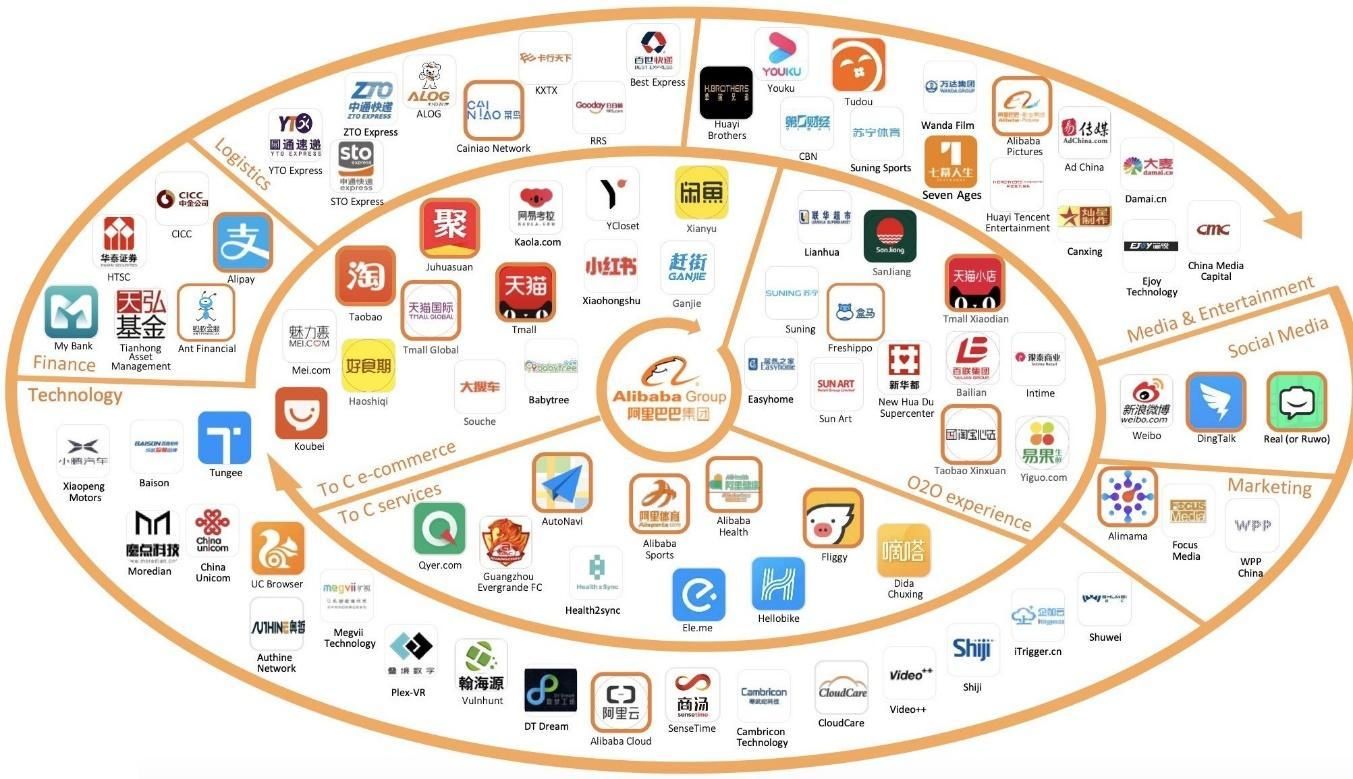 Особенностью развития экосистемы Алибаба является объединение широкого спектра сервисов с акцентом на активное внедрение цифровых технологий. Основная выручка компании формируется за счет ритейла, однако в то же время компания является лидером в Китае по развитию направления облачных вычислений, которое обеспечивается подразделением Alibaba Cloud. При этом компания работает над диверсификацией своего бизнеса, развивая такие сегменты, как медиа (Youku, Alibaba Pictures), потребительские сервисы (Amap, Ele.me) и др. Всего же Алибаба имеет долю в более чем 700 различных бизнесов, образуя крайне сложную корпоративную структуру.