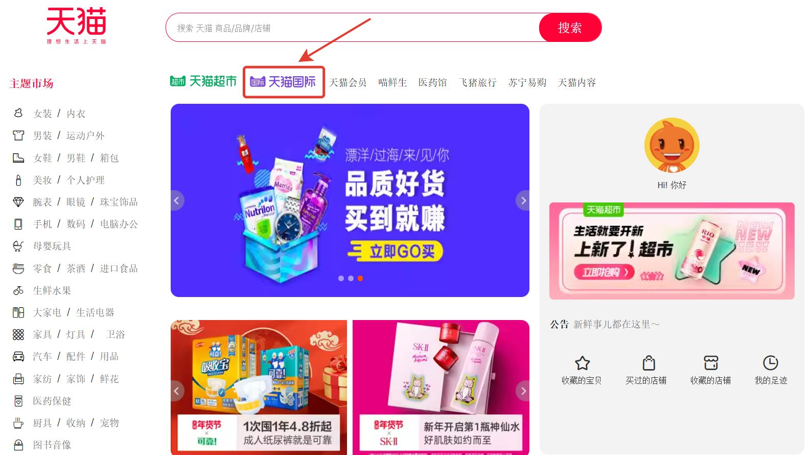 В десктопной версии вы можете найти ссылку на Tmall Global (天猫国际) в верней части сайта площадки Tmall.
