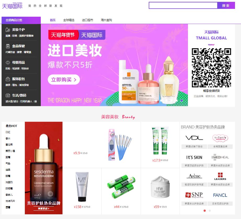 В 2014 году компания Alibaba Group запустила Tmall Global (Tmall.hk), платформу для трансграничной торговли, направленную на сотрудничество с международными брендами. У каждого продавца на платформе как и на Tmall есть своя витрина, которую можно полностью настроить по своему усмотрению, присутствуют разные виды магазинов, а также страницы отдельных стран с перечнем импортируемых из них товаров. Например, на Tmall имеется страница России, где вы можете найти российские продукты.