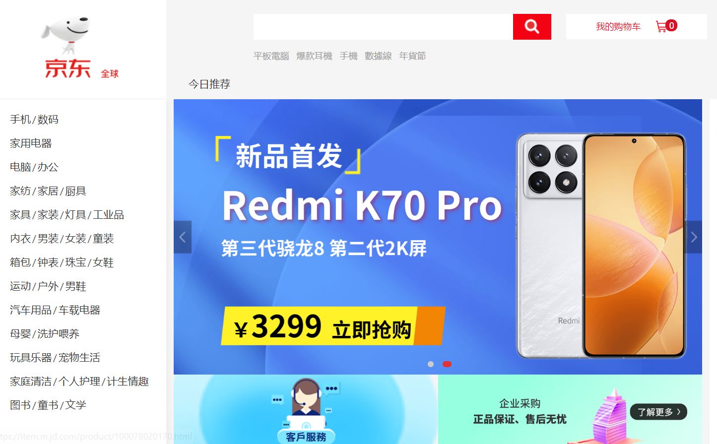 Интерфейс JD достаточно похож на Tmall и Taobao: слева располагаются товарные категории, а ниже идут отдельные товарные группы, в том числе "выбор JD" и "рекомендованные".
