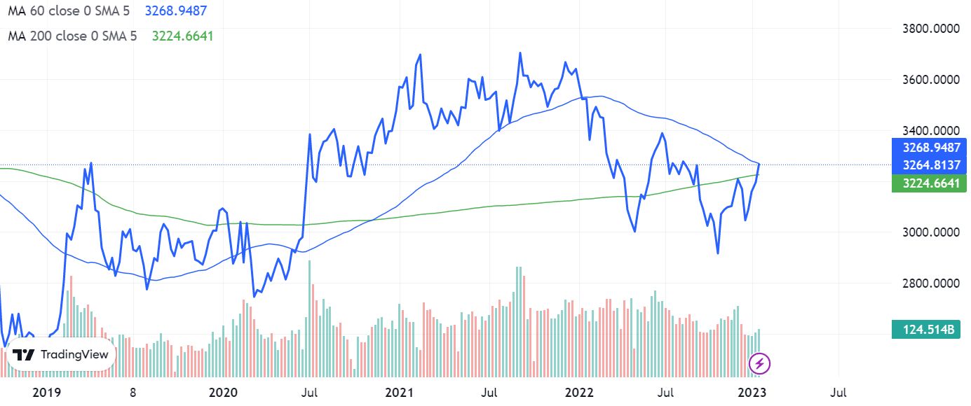Ситуация на фондовом рынке зачастую является опережающей для тенденций в экономике, что проявилось на примере текущих трендов на фондовых площадках Поднебесной. Так, фондовый индекс Шанхайской биржи SSE Composite закрывает последние недели в плюс. Глобальная динамика индекса не ушла в отрицательную плоскость, что подтверждает пробой уровня 200-дневной скользящей средней. В то же время индекс тестирует 60-дневную скользящую среднюю, что создает перспективы движения к уровню 3400 после ее пробоя.