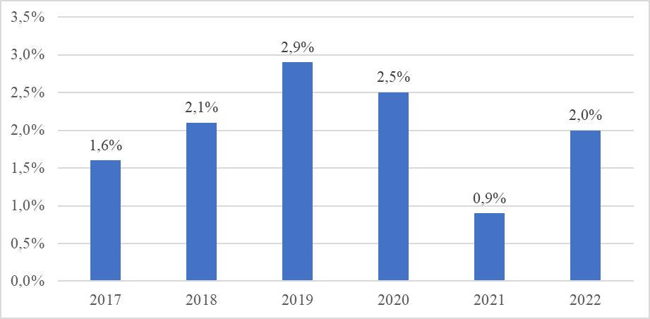 Соотношение средних темпов роста деловой активности и потребления за 2017-2022 гг.