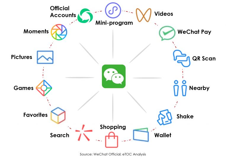 Финансовые опции, позволяющие пользователям платить не выходя из приложения повышают вероятность того, что потенциальные клиенты купят товары, добавив их виртуальную корзину. Также e-commerce, который широко представлен в WeChat, допускает использовать специальные акции и купоны, что выставляет его по возможностям в один ряд с такими гигантами, как Taobao (Tmall) и JD. Помимо этого, WeChat активно используется в привлечении аудитории через запуск рекламы в WeChat Ads/Tencent Ads, которая стоит сравнительно дороже, чем на других площадках, но открывает доступ к огромной аудитории и более глубокому таргетингу. Платформа WeChat открыта для привлечения к работе лидеров мнений, развития коммьюнити и много другого.
