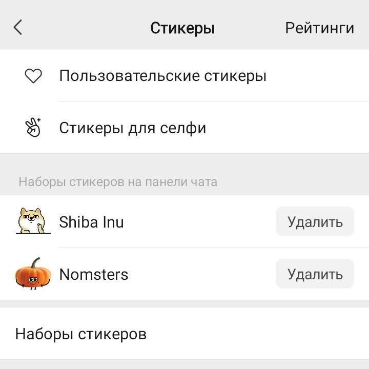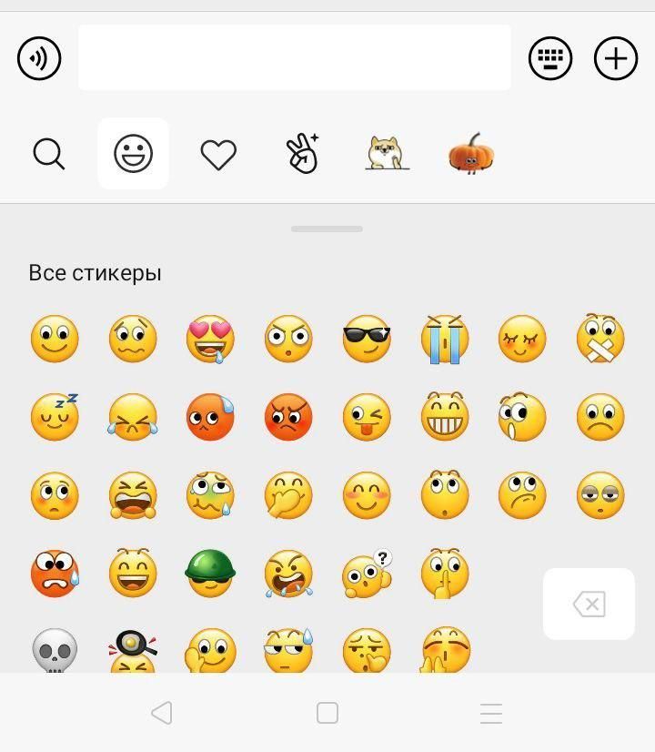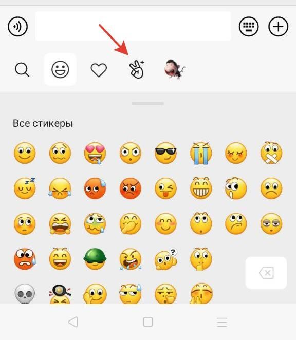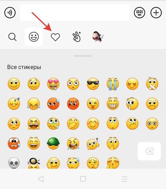 Здесь расположены различные смайлики, справа от смайликов располагаются пользовательские стикеры (значок сердца), селфи-стикеры (значок V), а также добавленные коллекции стикеров.