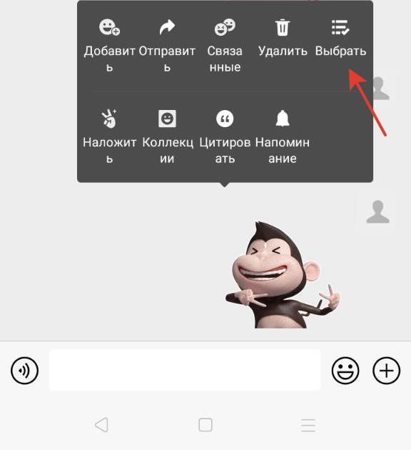 Чтобы сохранить какой-то файл из чата на мобильном девайсе, мы можем нажать на него (в данном случае – на гифку) и отметить “выбрать”. После этого нажимаем на иконку с конвертом и сталкиваемся с проблемой – отправить гифку в другую соцсеть или открыть ее в файловом менеджере не представляется возможным.