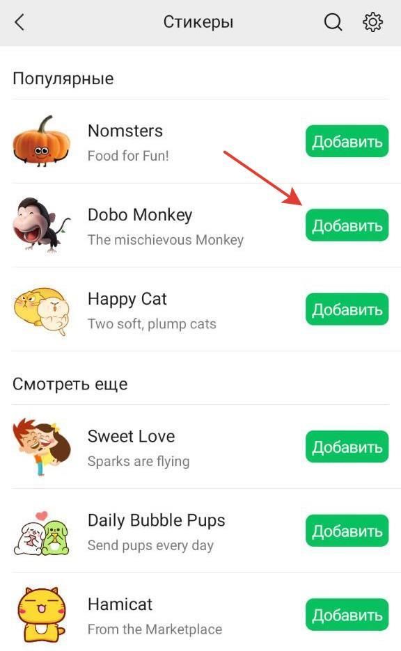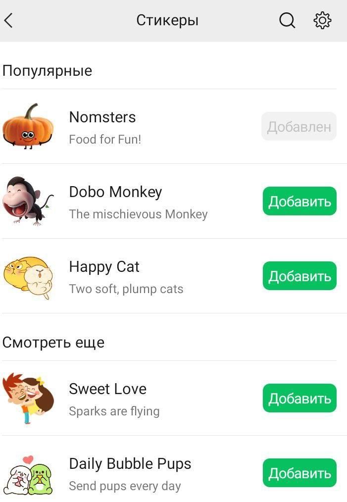 Здесь вы увидите Sticker Shop от WeChat, в котором отображаются готовые доступные наборы. Среди них сверху располагается набор наиболее популярных GIF изображений, следом за которыми идут другие наборы. Выберите понравившийся комплект и нажмите “добавить”.
