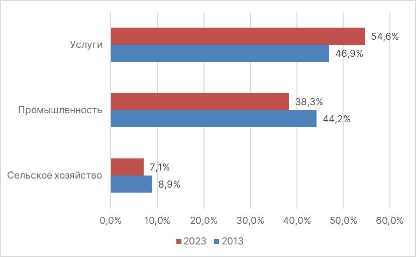 Распределение ВВП Китая по секторам экономики в 2013 и 2023 гг.