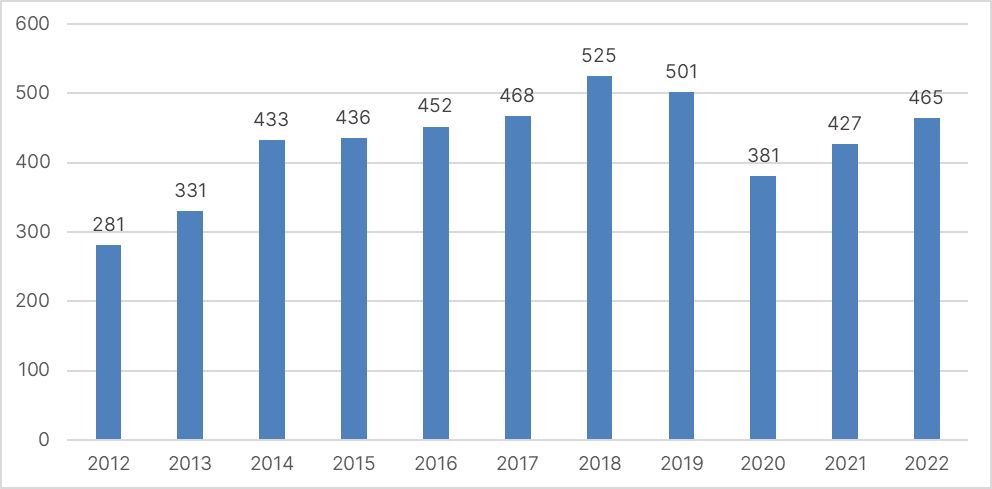 Стоимость импорта коммерческих услуг в Китай с 2012 по 2022 год (млрд долл)