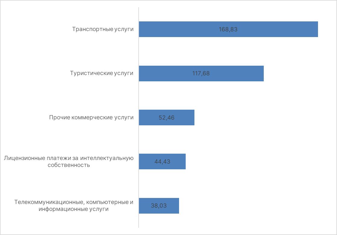 Стоимость экспорта услуг в Китай в разбивке по наиболее крупным категориям (млрд долл)