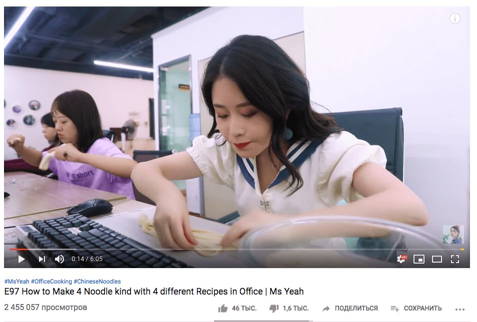 Пищевой, DIY и одновременно смешной блог ведёт Ms Yeah, чья слава давно распространилась за пределы Китая. Её контент — видео, в которых она готовит блюда прямо в офисе, используя для этого все мыслимые и немыслимые подручные средства. Серёжки из печенья Oreo, 4 вида лапши и лунные пряники, не покидая рабочего места, — неудивительно, что такие оригинальные ролики довольно быстро стали популярными в Интернете.