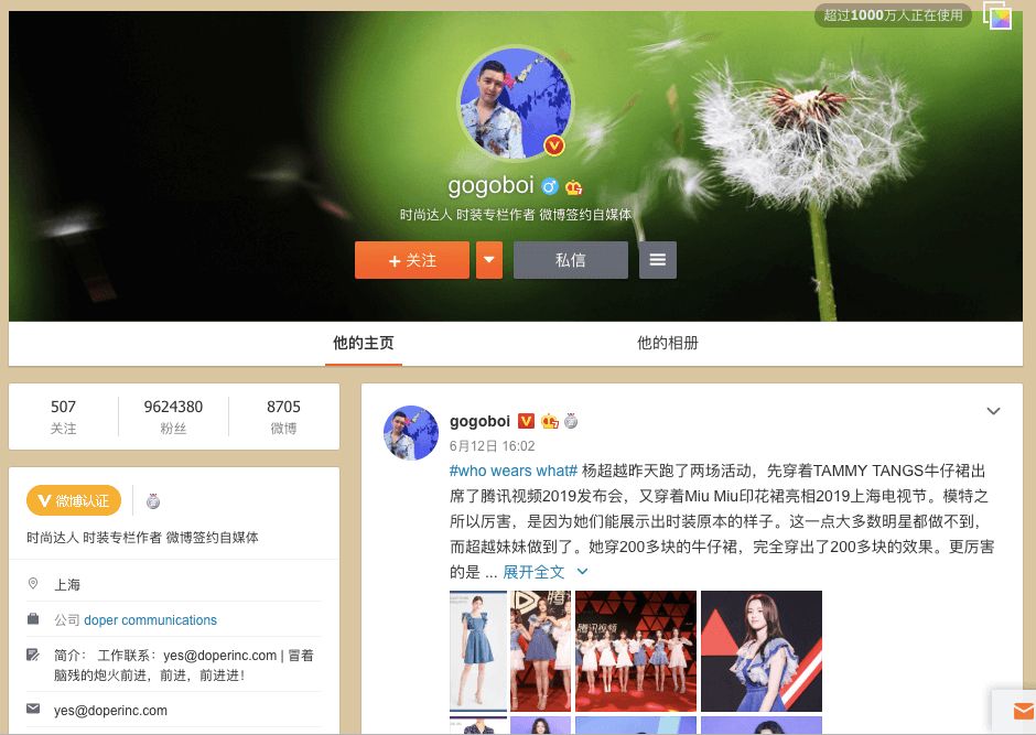 Gogoboi — один из самых известных фэшн-блогеров Поднебесной. Он делает обзоры на различные модные новинки, анализирует стили селебрити, модные тенденции и иногда даже рассказывает про макияж. В 2017 году он открыл собственный магазин в Wechat, где продаёт тщательно отобранные товары класса люкс, название его магазина можно перевести как “немногие избранные”. Это иллюстрирует ещё одну интересную особенность рынка китайских блогеров: часто топовые KOL не только рекламируют товары и услуги, но и открывают собственные магазины, где перепродают вещи, связанные с тематикой их блога. Такое одобрение с его стороны поднимает стоимость вещи в глазах подписчиков и увеличивает цену в несколько раз.