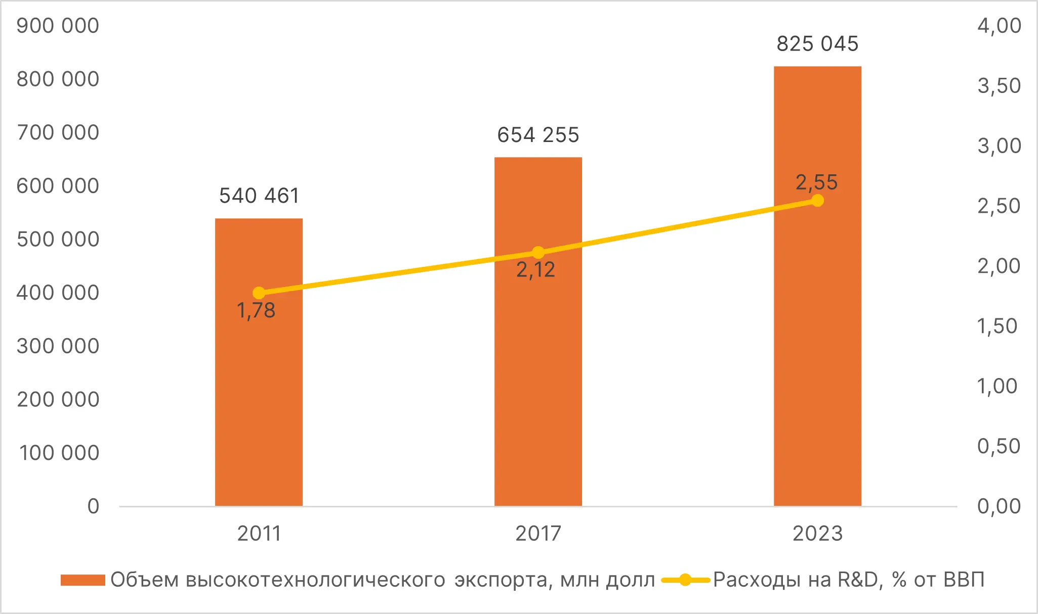 В 2010-е гг. Китай активно наращивал высокотехнологичный экспорт, что продолжается и на сегодняшний день. Развитие технологий в производстве можно проследить на примере роста расходов на R&D: в 2023 году они достигли 2,55% от ВВП. По сути современный Китай – это фабрика самых кастомизированных решений под любые ниши.