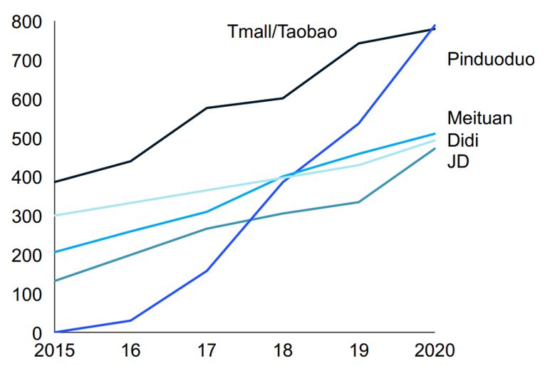 Число активных пользователей крупнейших китайских коммерческих сервисов в год (млн чел)
