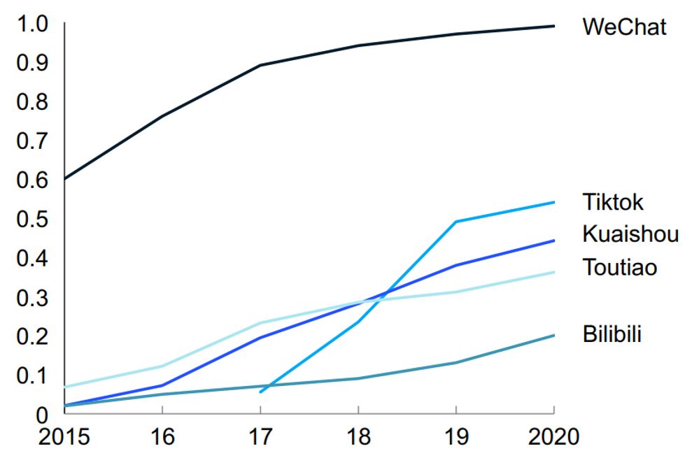 Стоит принять во внимание еще одну особенность китайской экономики – акцент на внедрение инноваций (средний рост расходов на R&D в Китае составил 12,2% за последние 5 лет) и стремительную цифровизацию (добавленная стоимость цифровой экономики составила 38% от ВВП Китая в 2020 году). Еще в 2020 году число активных интернет-пользователей в Китае составило 989 млн человек, что в 3,4 раза больше, чем в США. В то же время китайцы все больше времени проводят в мобильных сервисах: по данным McKinsey, в 2017 году среднее время пользования мобильным телефоном составило 278 минут, а уже к середине 2020 года оно выросло до 358 минут.